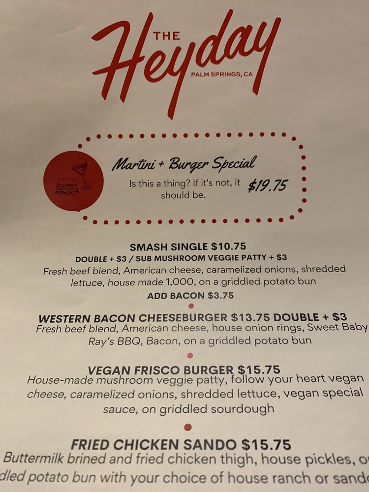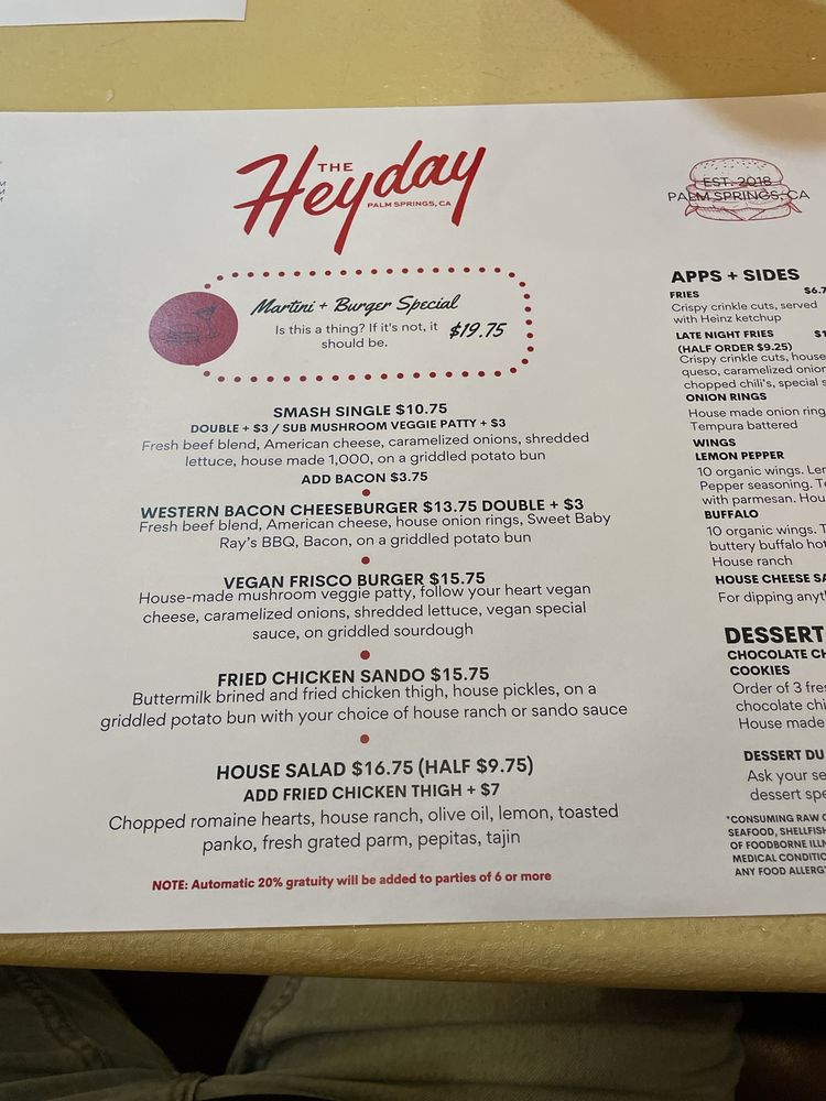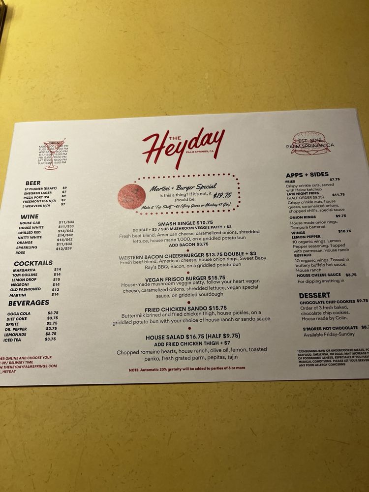 The Heyday in Palm Springs is a trendy burger spot that offers a cozy atmosphere and top-notch service. With a small but focused menu, they specialize in delicious burgers and unique cocktails. Customers rave about the smash burger, lemon pepper wings, and house salad. The friendly staff and welcoming vibe make every visit a pleasant experience. The late-night fries, martini and burger specials, and dog-friendly policy add extra charm to this gem of a restaurant. The attention to detail in the food and the quick service ensure a memorable dining experience. With a Latinx and women-owned identity, The Heyday stands out not only for its tasty offerings but also for its commitment to inclusivity and sustainability. Don't miss out on this cool Palm Springs spot for a burger experience like no other.